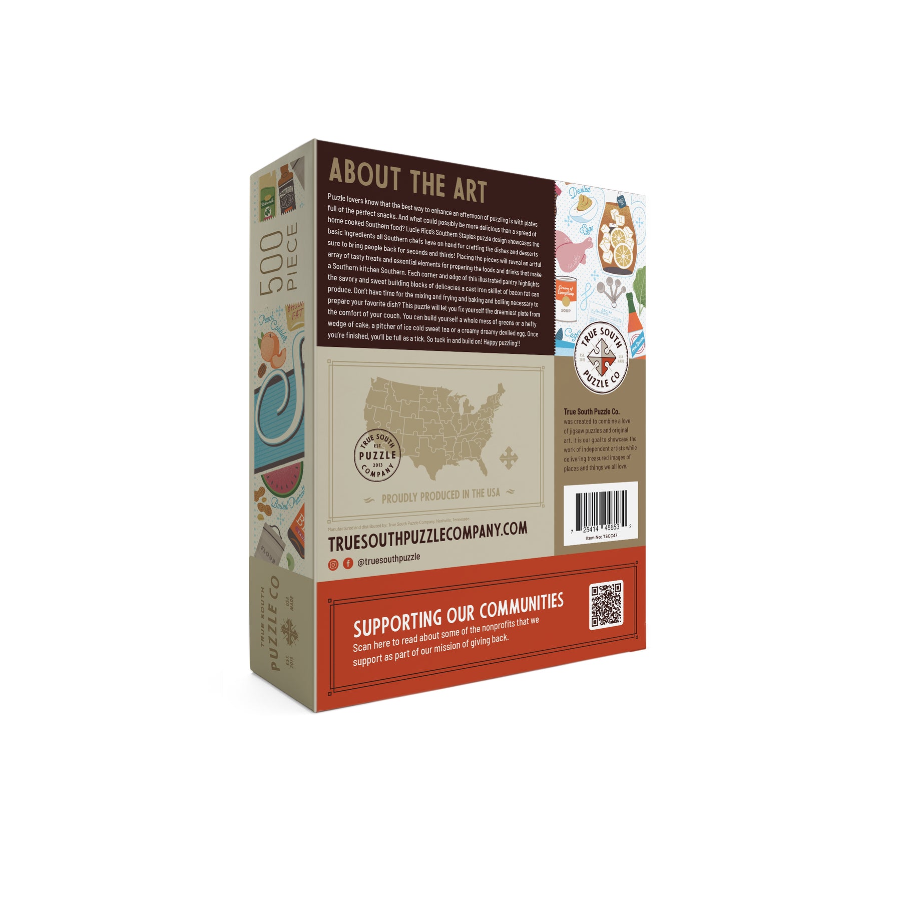 Puzzle lovers know that the best way to enhance an afternoon of puzzling is with plates full of the perfect snacks. And what could possibly be more delicious than a spread of home-cooked Southern food? Lucie Rice’s Southern Staples puzzle design showcases the basic ingredients every Southern chef keeps on hand for crafting the dishes and desserts that bring people back for seconds and thirds.