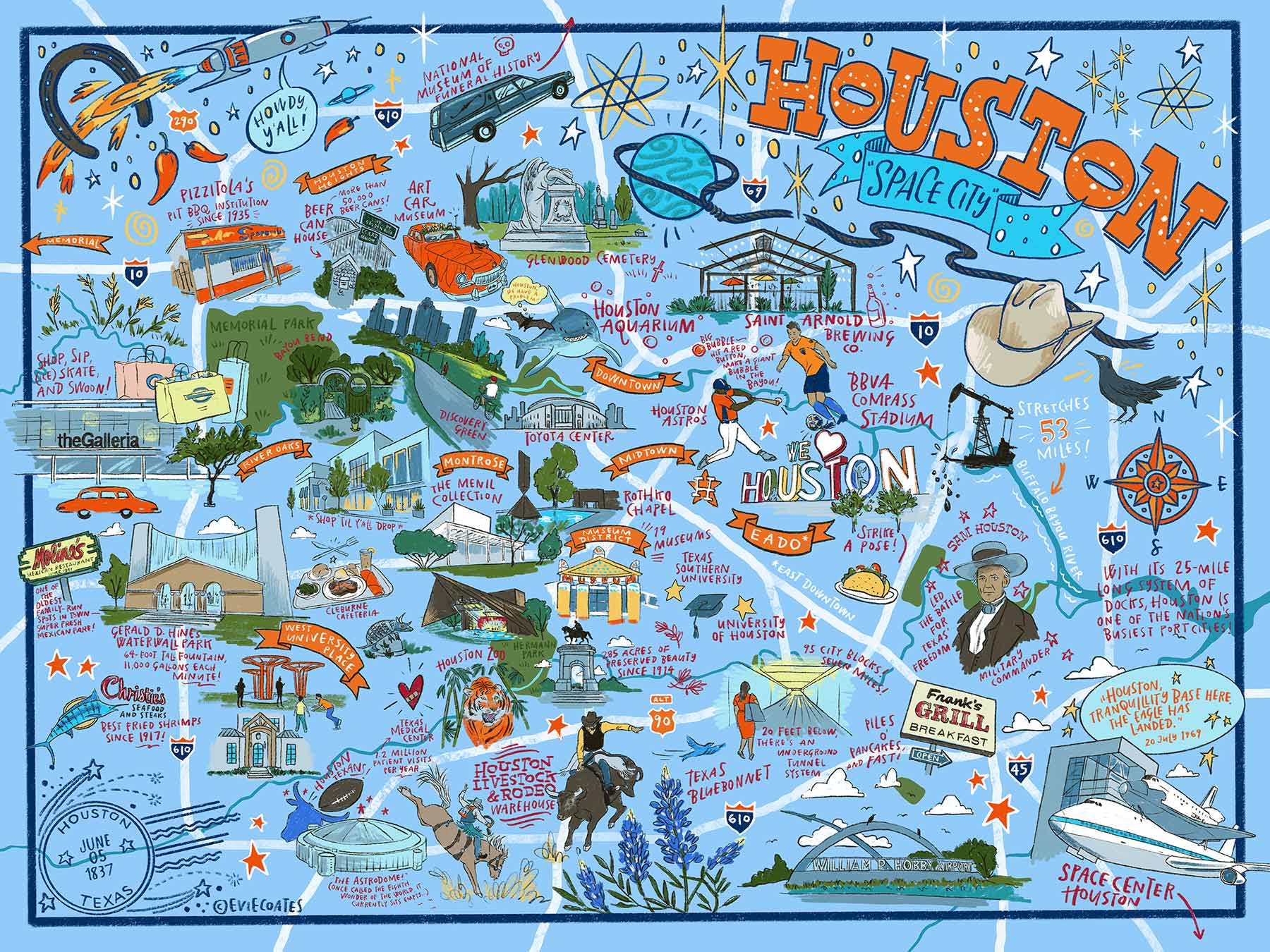 The Space City! Put together the pieces of this puzzle map, designed by artist Evie Coates, to learn fun facts and find the stars of Houston's commerce and culture.