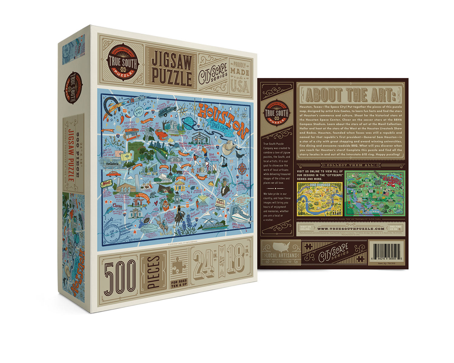 Our puzzles are created in a collaborative effort between artists and True South to highlight unique facts carefully researched about each location. Fun facts are listed on the back and inner sides of boxes.