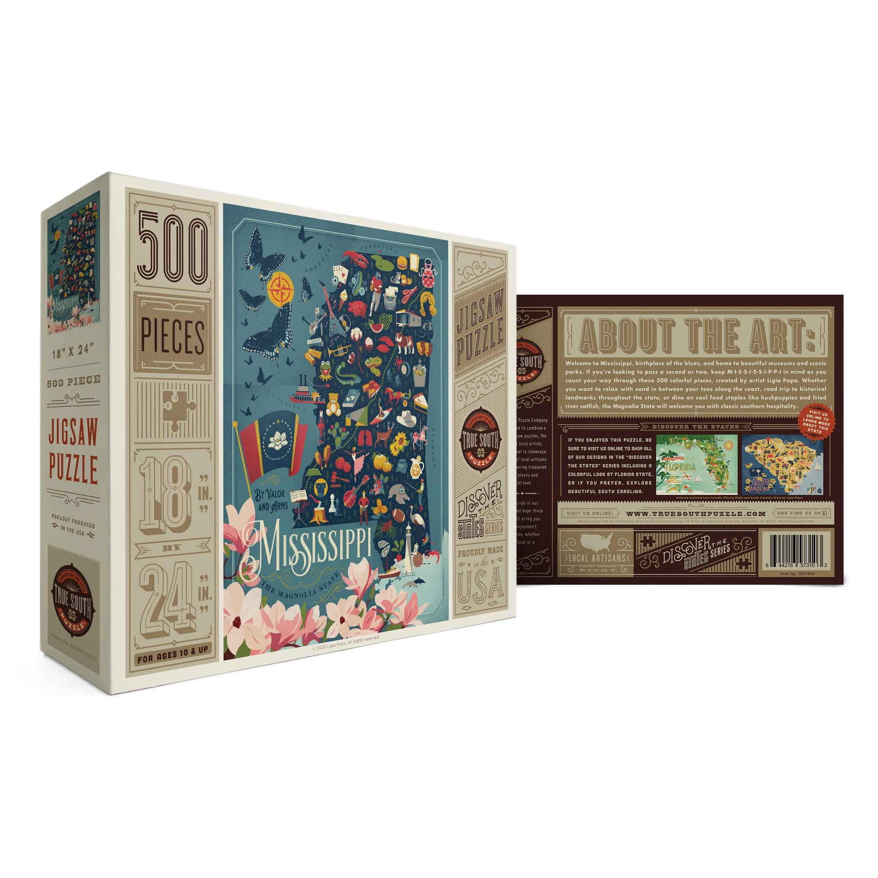 Our puzzles are created in a collaborative effort between artists and True South to highlight unique facts carefully researched about each location. Fun facts are listed on the back and inner sides of boxes.